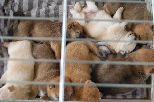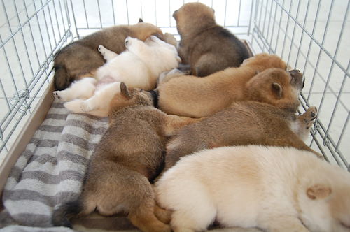豆柴ちゃんたち、みんなで集まってお昼寝しています♪