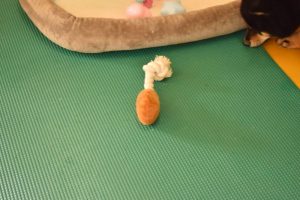 どのおもちゃを選ぶのかな?と様子を見ていたら、ホットドックに紐がついたおもちゃを選びました!