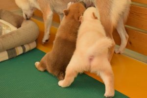 お母さん犬のお乳に集まって一生懸命にミルクを飲んでいます。