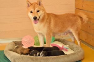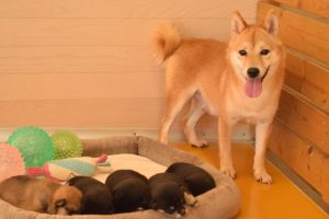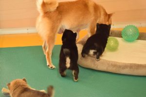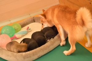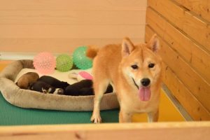 お母さん犬は愛情たっぷりに赤ちゃん犬を育ててくれています(^^)。
