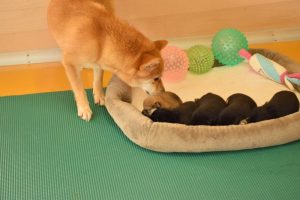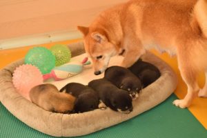 お母さん犬は愛情たっぷりに赤ちゃん犬を育ててくれています(^^)。