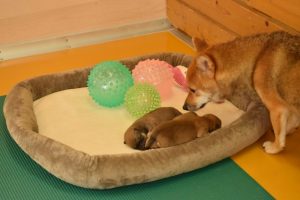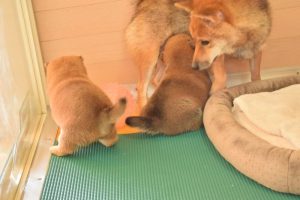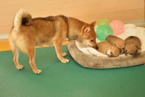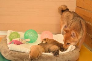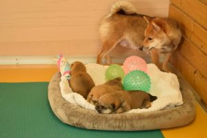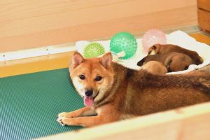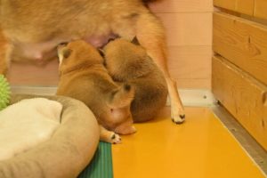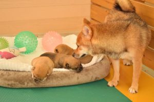 お母さん犬は愛情たっぷりに赤ちゃん犬を育ててくれています(^^)