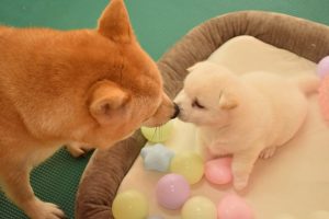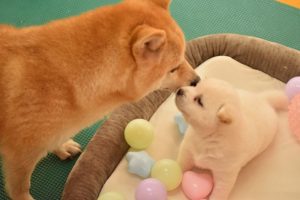 お母さん犬は優しく赤ちゃん犬に鼻チューしています♪