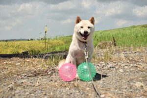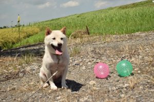 こんにちは。今日は白豆柴の女の子と外でボール遊びをしてみました(^^)